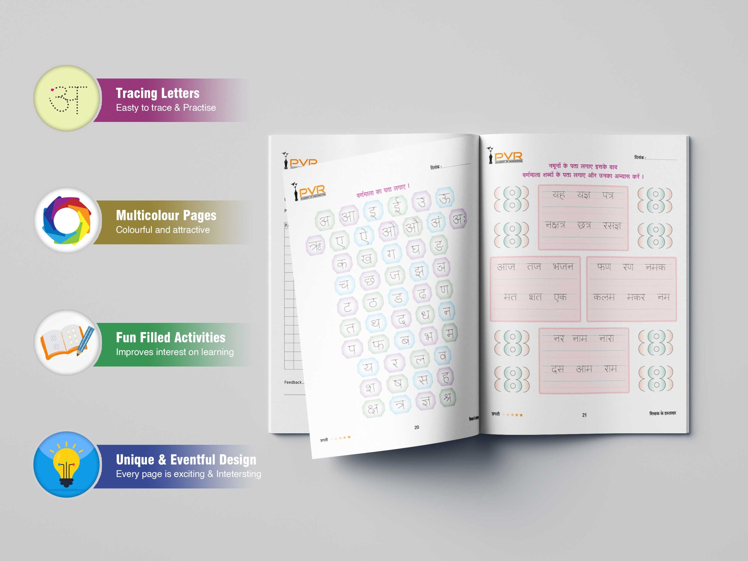 Designed to build fluency in Hindi handwriting using the Devanagari script. Level Level A includes: